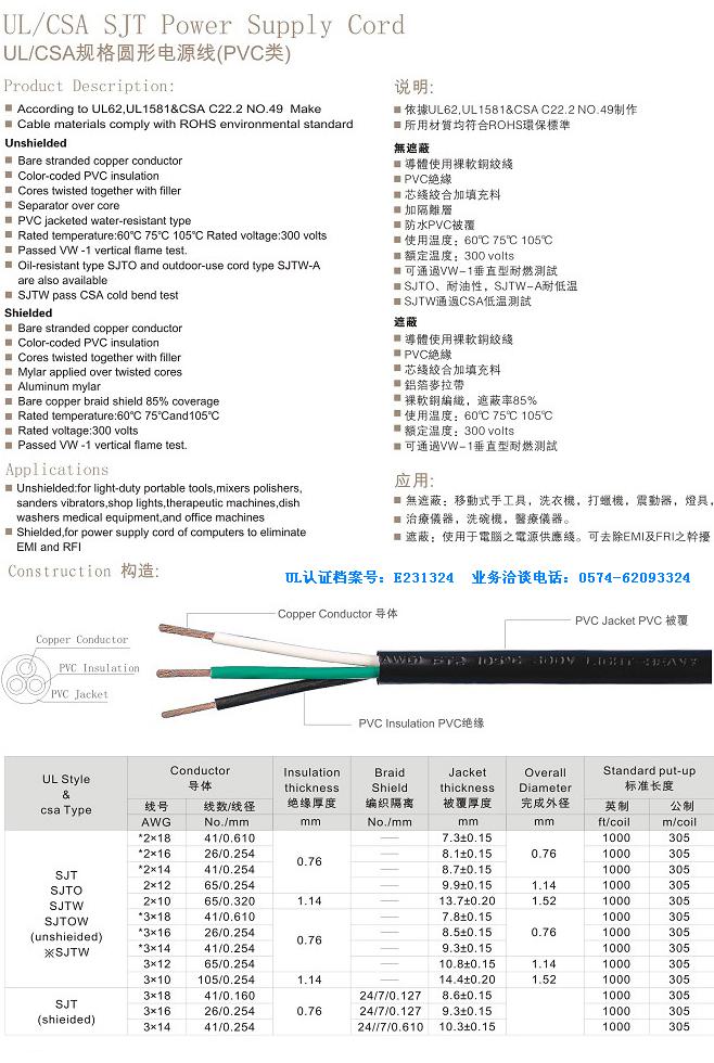 <UL> SJTW 105℃ VW-1 16AWGx3C 300V E231324 JingYi 463217-001¤CSA SJTW 105℃ FT1 16AWGx3C 237240